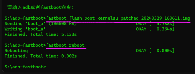 9. **执行刷入命令** 在电脑上打开 adb-fastboot 目录中的 CMD 命令行(.bat 文件),输入以下刷写指令(注意:kernelsu_patched-xxx.img 的具体名称以实际生成为准):