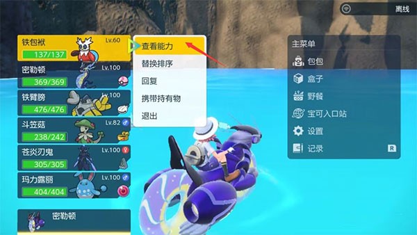 1、打开主菜单,选择“宝可梦”进入队伍列表,点击任意一只宝可梦查看其能力详情。