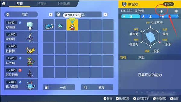 2、在右侧信息栏中,若宝可梦名字旁显示两个四角星标志,则说明它是闪光宝可梦。