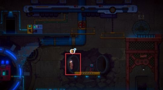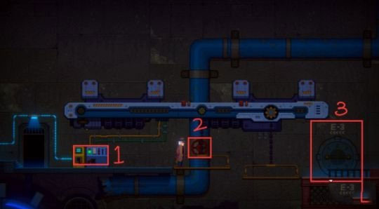 电流接通后,操作下图所示的控制台【1】,升降台随即升起。此时转动升降台上的红色阀门【2】,引导水流。途中可顺道进入最右侧的【3】E-3门,拾取【遗落的机器人笔记】。