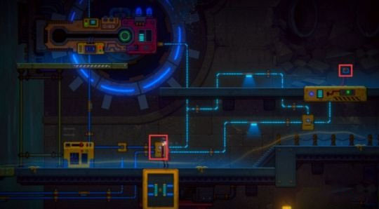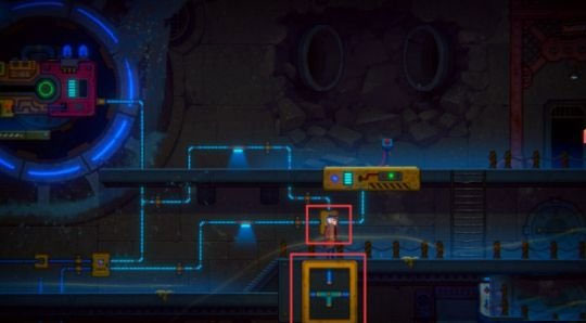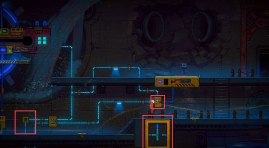 继续下行,调整水车下方的电分流器,使其电路走向与图示一致。随后前往右侧,按下升降台的红色按钮,使平台浮起。
