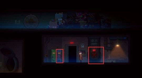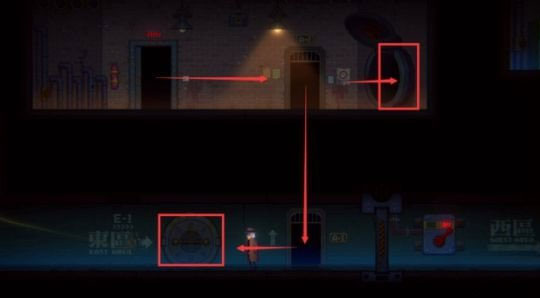 离开房间后,可沿箭头方向下行进入E-1区域,或向右穿过管道放下升降梯,两种路径均可返回主区域。