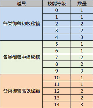 各类御兽技能所需材料及数量如下: