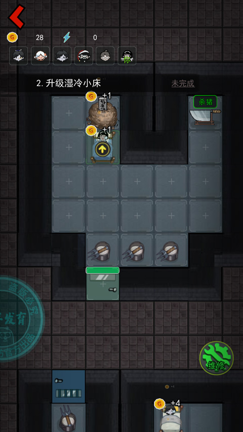3、门血量管理技巧:门在被猛鬼攻击时血量会持续下降,此时若在其濒临破损前进行升级,可瞬间回满当前等级的全部耐久。善用这一机制,能有效延长防守时间,为武器研发和整体发育创造空间。