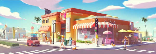 以游戏内烘焙店为例:采用橙红黄暖色调的Q萌西式快餐风格,选址于城镇中心,双层楼设计配以特色石砖铺地;外部设置黑白桌椅与遮阳伞,半掩窗搭配红色遮阳棚,既实用又富趣味性——甚至贴心配备了公共卫生间(开发者的小幽默)。