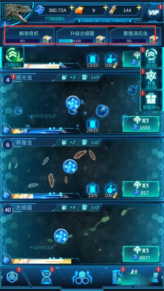 - 进入图鉴面板,对已解锁生物进行升级,显著提升DNA产出效率。