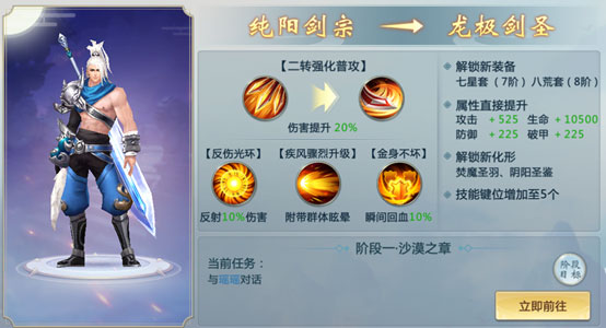 纯阳剑宗达到220级后可进行二转,同样包含3个任务阶段。成功转职后成为龙极剑圣,核心增强包括: