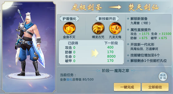 龙极剑圣达到280级后开启三转,任务共4个阶段。因材料需求较多,游戏贴心提供一键完成功能:花费1000元宝即可跳过全部任务,直接转职。成功后成为焚天剑仙,获得: