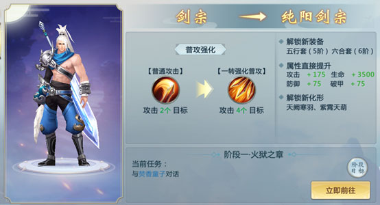 角色达到150级后开启一转任务,共3个阶段。完成后进阶为纯阳剑宗,获得以下核心提升: