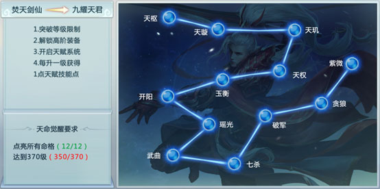 焚天剑仙达到350级后开启四转,需点亮全部12个命格并升至370级方可完成。命格可通过经验值或天命魂石激活,商城亦可购买魂石加速进程。转职成功后晋升为九耀天君,解锁: