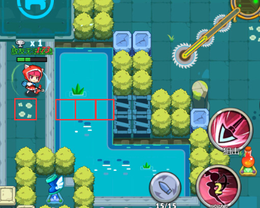 以下图为例,图中水域约3码宽(1格=1码)。若站在指定位置释放突袭,猎手会先翻滚至水域中央,随后被强制传送至对岸,总位移可达约4.5码,实现高效越障。