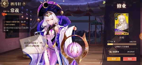 修业:通过委派任务获取书卷,在居所中进行属性修炼。提供两种选项——20书卷/2小时 或 100书卷/10小时,收益比相近,按个人时间灵活选择。修业上限由“缘念等级”决定,是提升战力的重要补充。