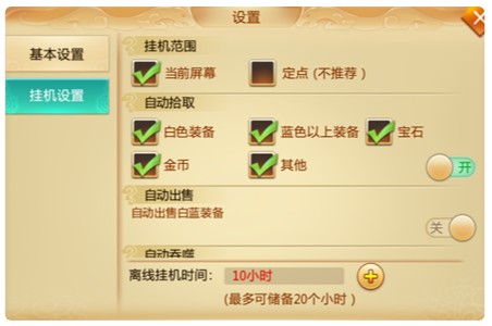 4、玩家可通过“设置”→“挂机设置”自定义挂机行为,包括自动拾取、出售、吞噬装备,以及是否开启离线组队或自动买活等选项。