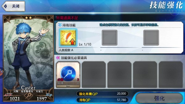 使用特定技能升级素材与QP,将从者技能从初始Lv.1提升至最高Lv.10,显著增强战斗表现。