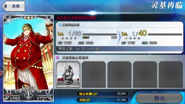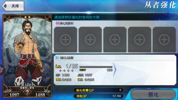 消耗经验值卡(俗称“狗粮”)、ATK/HP提升卡(如梅林)及QP,为从者增加经验或提升双围数值。单次最多使用5张素材卡;若包含3星(R)及以上稀有度卡片,系统将弹出确认提示。此外,也可直接消耗其他从者作为经验来源。