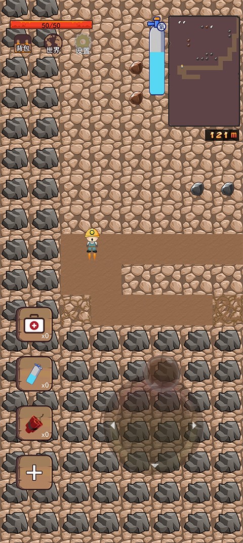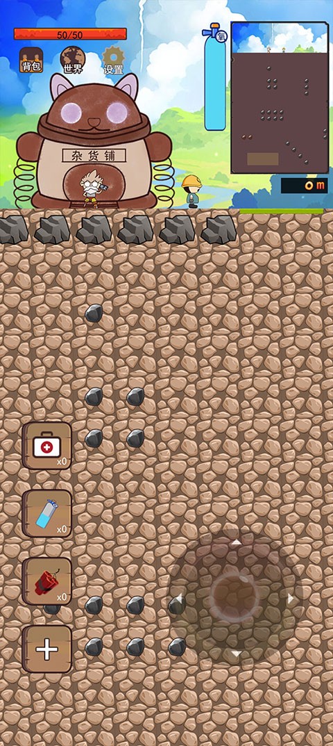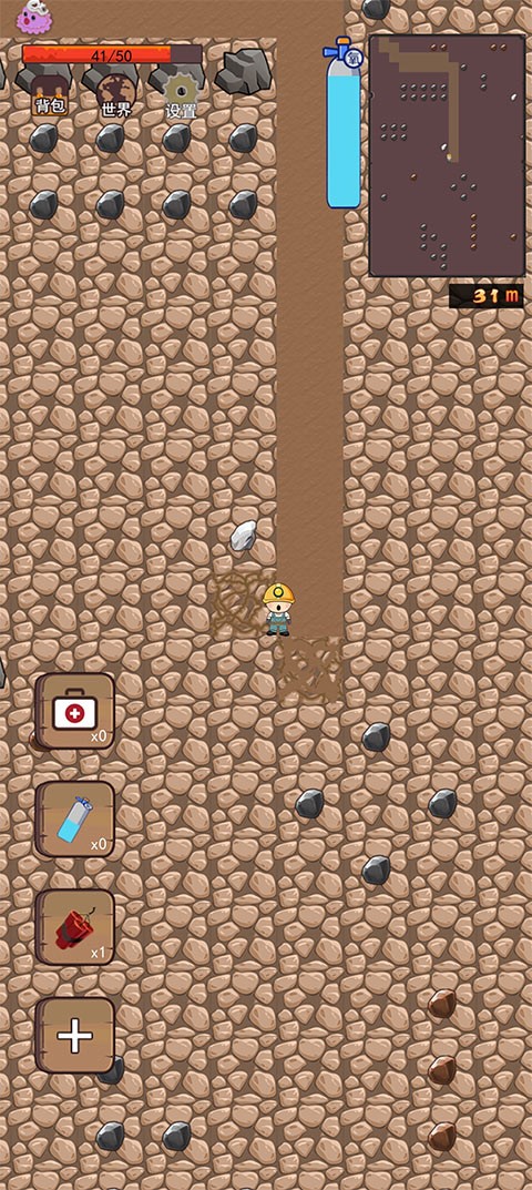 3、深入地下后需注意氧气限制——地图边缘显示的氧气瓶代表当前剩余氧气量。一旦耗尽,必须及时返回地面补充。左下角为道具栏,可在杂货铺购买实用装备辅助挖掘。