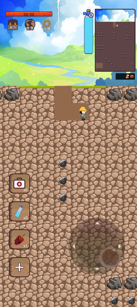 2、剧情结束后即进入操作阶段,通过屏幕上的虚拟摇杆控制挖矿小人移动,支持上下左右四个方向,操作直观流畅。