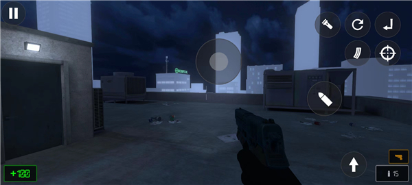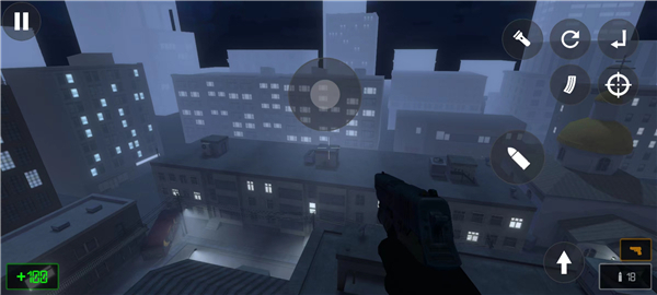3、通过屏幕上的虚拟按键操控角色:左下角区域控制移动方向,右下角区域负责瞄准与开火等战斗操作。