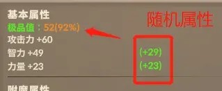 · 基本属性与随机属性:基本属性固定(如攻击力+60、智慧+20),右侧绿色数字为随机属性(如智慧+29、力量+23)。所有随机属性之和即为极品值(本例为52)。该值可通过锻造台精炼提升,右侧百分比表示当前极品值占理论最大值的比例(如92% → 最大值约56~57)。