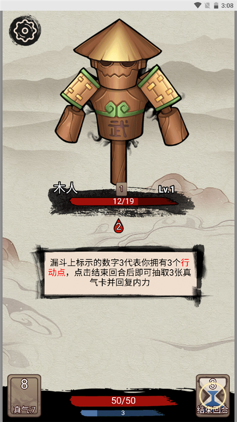 - 屏幕上方漏斗图标旁的数字“3”代表你本回合拥有3个行动点;点击“解锁回合”后,系统将自动为你抽取3张真气卡并恢复全部内力。
