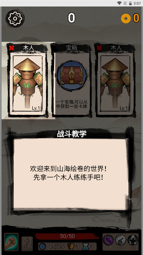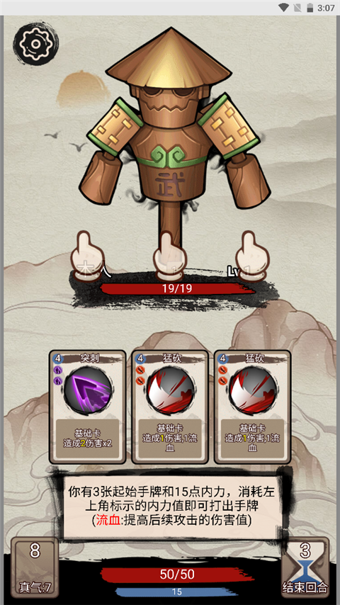 - 初始你将拥有3张手牌和15点内力,每张卡牌左上角标注所需消耗的内力值,满足条件即可打出。